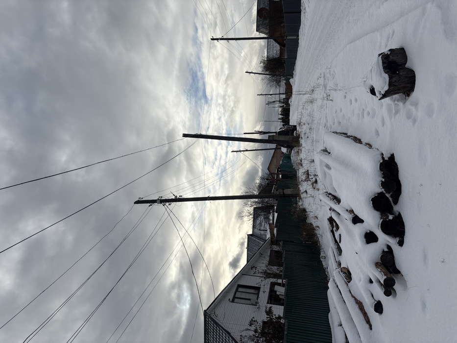 The image depicts a snow-covered residential street in Невон, Russia, under a predominantly overcast sky with areas of brighter cloud. In the foreground, a stack of cut timber logs lies partially covered by snow on the left side of the unpaved street, adjacent to a snow-covered tree stump and marked by fresh human footprints. A green corrugated metal fence runs parallel to the street on the left, separating it from a two-story house with white siding and a dark, sloped roof. Multiple dark utility poles with numerous overhead lines extend along both sides of the snow-covered roadway into the background. Some poles appear to be leaning. Further down the street, additional residential buildings with dark roofs are visible. A dark vehicle is parked on the right side of the road, partially obscured by a utility pole. The unpaved street surface is covered in snow, displaying visible tire tracks. Bare trees are interspersed among the structures. No individuals or animals are present, and no overt actions or interactions are occurring.