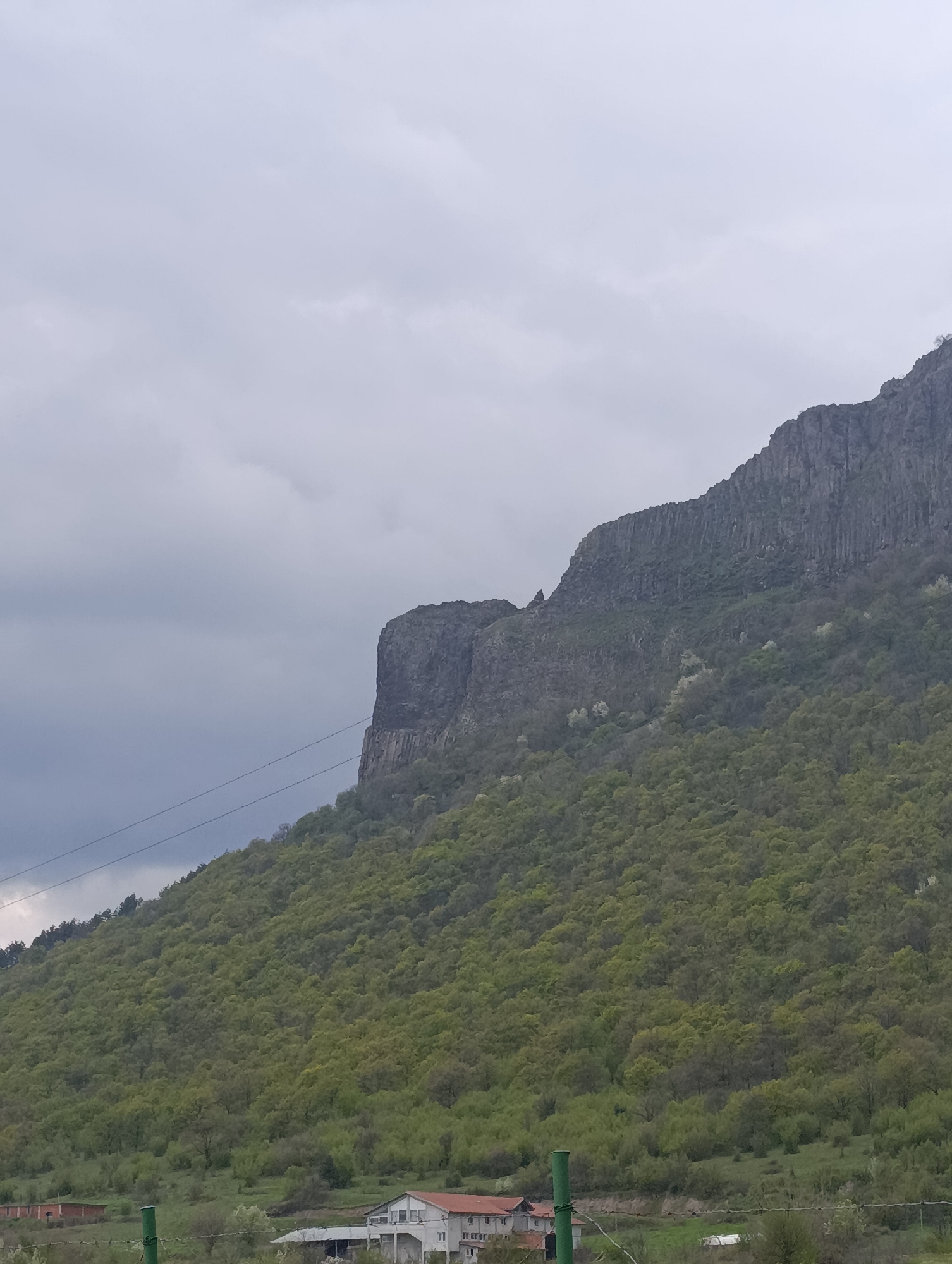 mountain located in the city of Shiroko pole, Bulgaria. The mountain has two distinct rock formations at the top, and the slope is covered in dense green trees. In the foreground, there are a few houses, green poles, and power lines. The sky is overcast and grey.