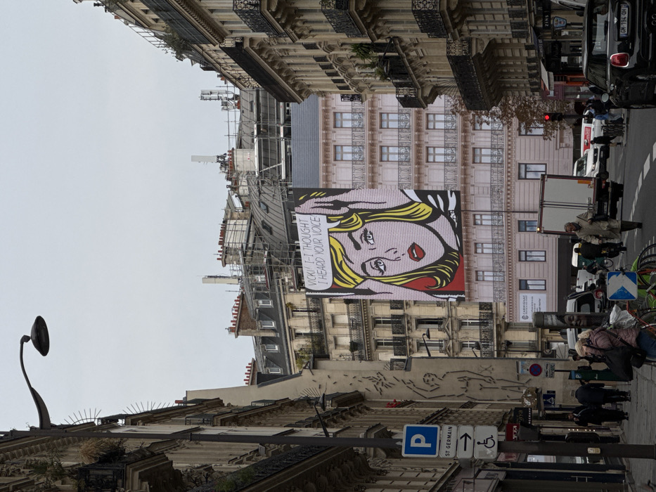 This urban scene depicts a street in the Saint-Germain-des-Prés district of Paris, France, under an overcast sky. The prominent feature is a large pop art mural, in the style of Roy Lichtenstein, covering the facade of a building located at 34 Rue de Rennes. The mural illustrates a woman's face with yellow hair, red lips, and Ben-Day dots, accompanied by a speech bubble stating: "VICKI! I-I THOUGHT I HEARD YOUR VOICE." The street is flanked by typical Parisian multi-story Haussmannian buildings, featuring light-colored stone, uniform windows, and wrought-iron balconies; some rooftops exhibit scaffolding and communication antennae. In the immediate foreground on the left, a black, curved streetlamp extends over the roadway. Below the lamp, a blue parking sign indicates "ST GERMAIN" with a right-pointing arrow and a disabled access symbol. Multiple pedestrians are visible on both sidewalks, with several gathered on the left near parked bicycles. The roadway contains vehicular traffic, including a white box truck moving away from the viewer in the center and a black Mini Cooper (French license plate GM-194-QH) parked or moving slowly on the right side. A red traffic light is visible on the right.