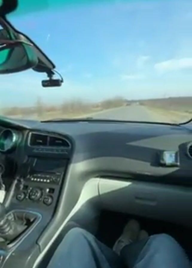 interior of a Peugeot 3008 driving down a rural road on a sunny day. The sky is blue with a few clouds. The road is straight with a few other cars visible in the distance. The car's dashboard is visible with a gear stick, radio, and various buttons and controls. A dashcam is mounted below the rearview mirror. The driver is wearing a light gray sweatshirt and the passenger is wearing blue jeans. Music is playing in the background.