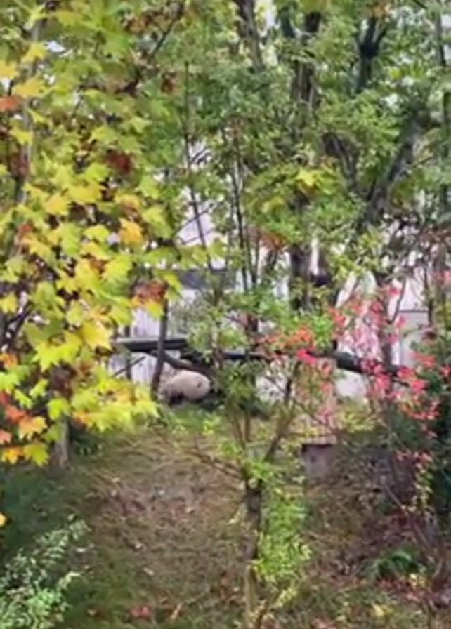 lush green area with trees in the foreground. Some trees have yellow and red leaves. In the background, a white building is partially visible through the trees. A small figure, possibly a person, is seen under a wooden structure near the building. There is a slight slope in the landscape. The overall environment appears to be a park or garden setting.