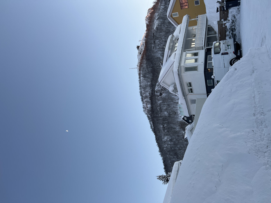 A daytime view shows a snow-covered landscape. A white house with multiple windows stands next to a wooded, snow-dusted mountain. A yellow building is situated next to the house. Snow covers the ground, forming drifts. A white van is parked by the house. The sky is clear blue with a small crescent moon visible.