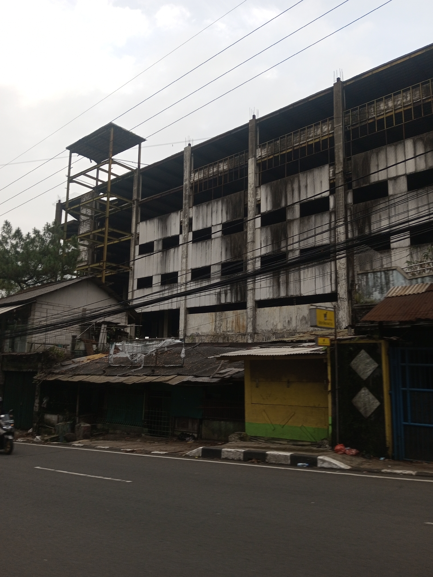 The image depicts a street scene in Ciherang, Indonesia. A multi-story, dilapidated building dominates the background, showing signs of neglect with streaked walls and visible structural elements. In front of the building are smaller, informal structures with corrugated metal roofs and painted facades. Power lines are heavily strung across the sky, adding to the urban decay. The street is asphalt with a painted white line and a curb of alternating black and white segments. A motorcycle is partially visible on the left side of the frame. Overall, the scene suggests an impoverished or neglected urban area.
