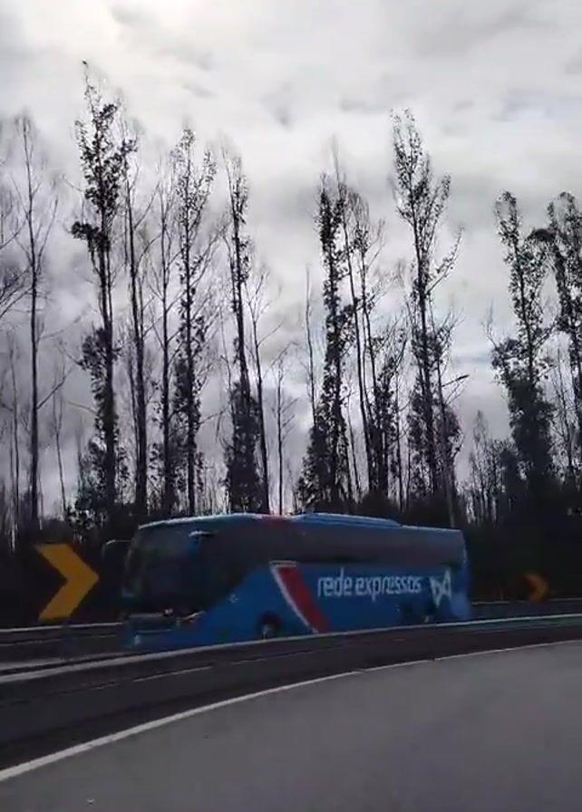 highway on a cloudy day. The road is paved with asphalt and has a white line marking the lane. There are several vehicles on the road, including a blue bus, silver cars, and a blue truck. A line of tall, bare trees stands on the side of the highway. There are also yellow chevron signs marking the turns in the road. The sky is partially covered with clouds, with some patches of blue visible. The video appears to be taken from inside a moving vehicle.