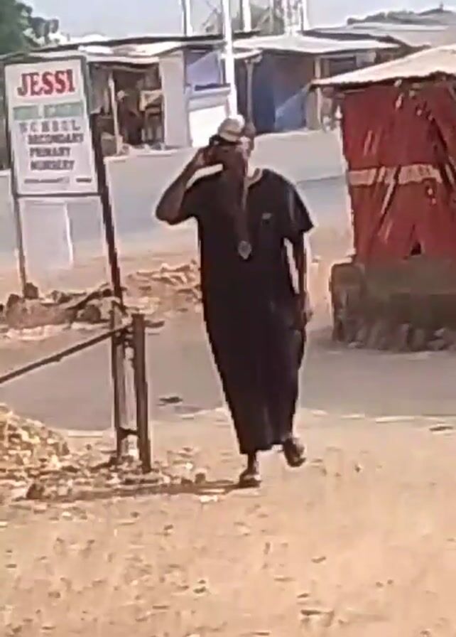 A man dressed in a long black robe and a white baseball cap walks towards the camera while talking on a cell phone. He wears sandals and what appears to be a religious necklace. Behind him, a yellow tuk-tuk is parked on the side of the road. A red corrugated metal structure stands on the right side of the frame, and a sign for "JESSI SCHOOL" is visible to the left. In the background, a white water tower is present. The ground is dry and dusty. A motorcycle passes behind the man.