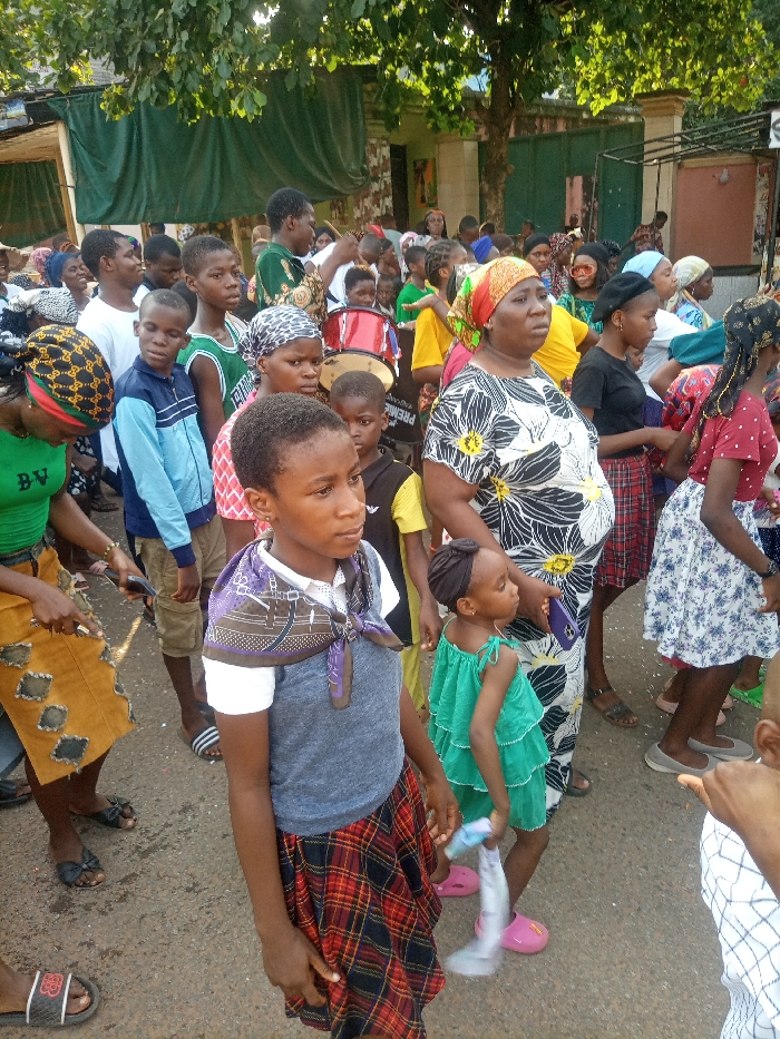 In Akpaka Forest Reser, Nigeria, a dense crowd of approximately fifty individuals, including adults and children, occupies a paved street under natural daylight