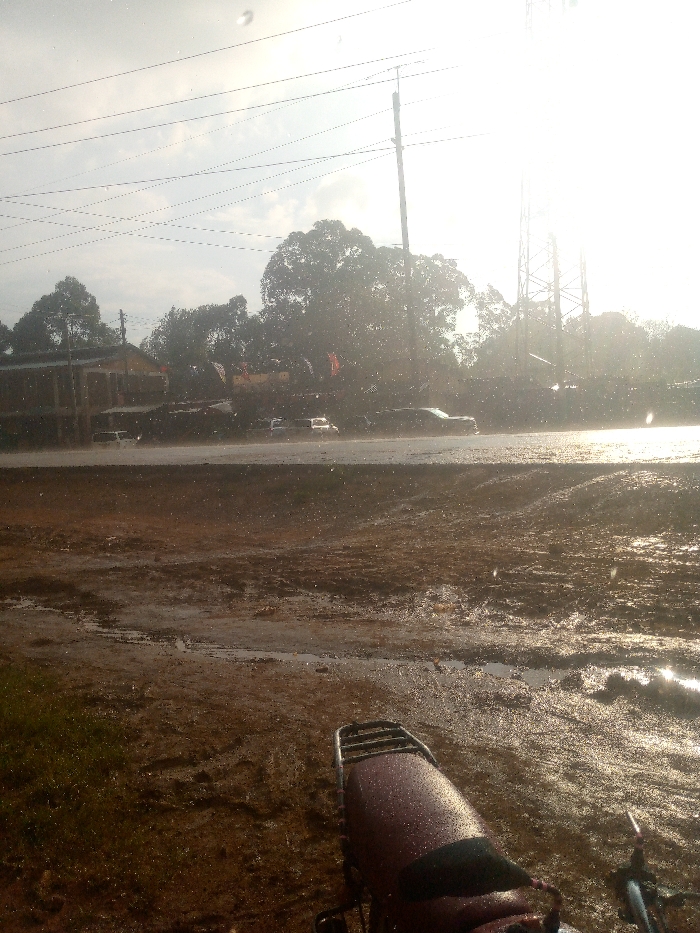 The image depicts a wet, outdoor urban or semi-urban scene in the city of Unknown, Unknown, viewed from a low perspective. In the immediate foreground, the maroon-colored seat and rear rack of a motorcycle, covered in raindrops, are partially visible. The ground directly ahead is an unpaved, muddy area featuring numerous puddles, wet soil, and visible tire tracks, with sparse green vegetation on the far left. A wet, paved road spans the mid-ground horizontally, reflecting strong sunlight from the right. Several vehicles are present on this road: a white sedan and another white vehicle are visible on the left, followed by a dark-colored sedan further right. Additional vehicles are indistinct in the distance due to atmospheric conditions. Visible water droplets are suspended in the air across the scene, indicating ongoing or recent rainfall. The background features a two-story building with a dark roof on the far left, partially obscured by dense green trees that extend across the center of the image. A tall utility pole with multiple horizontal power lines stands centrally. To the far right, a large metal lattice tower is silhouetted against intense glare from the sun, which dominates the upper right quadrant of the sky. The sky is largely overcast but intensely bright on the right side. No individuals are discernible, and no specific actions or interactions involving people are evident.