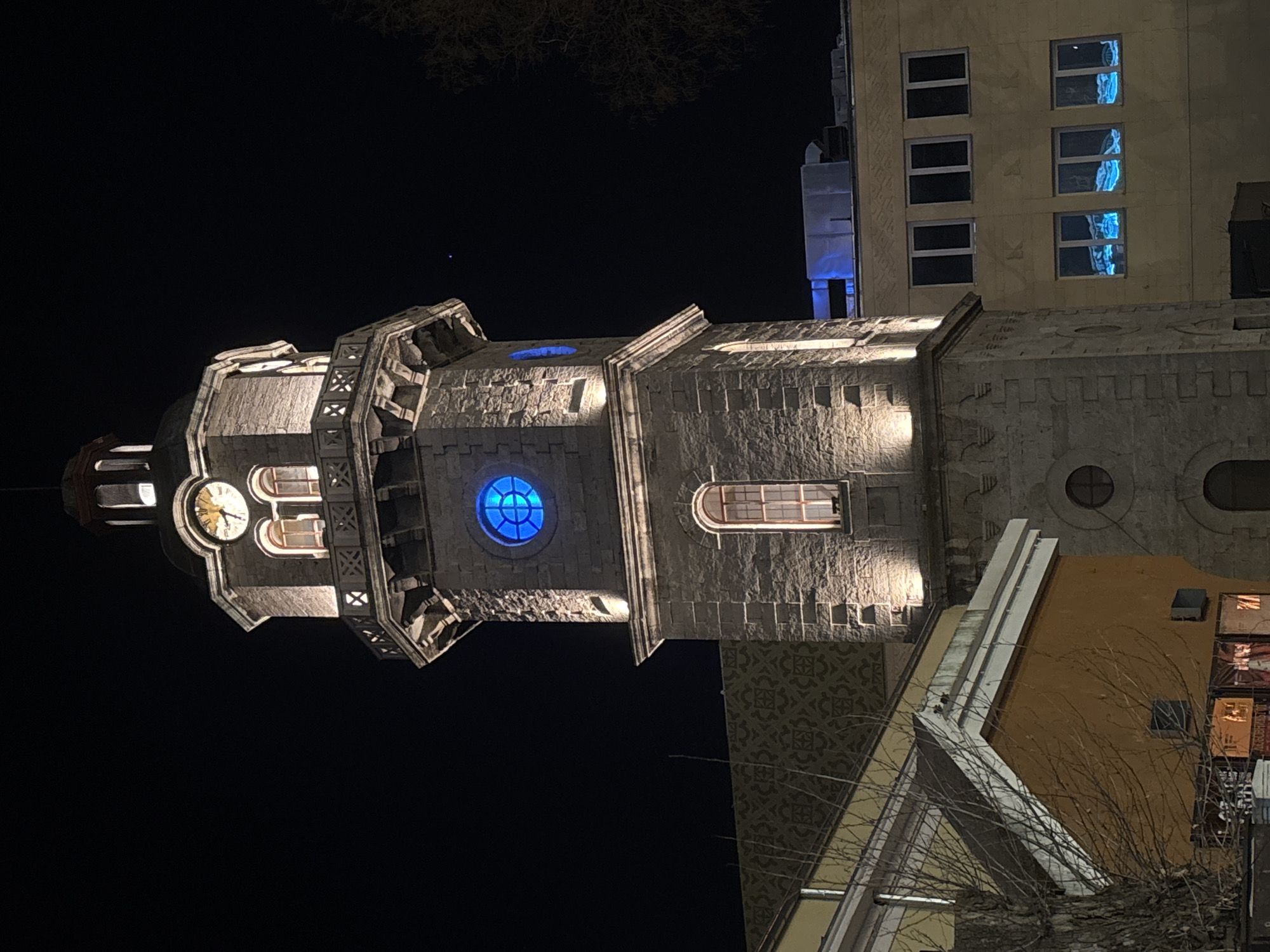 The image displays the Varna Clock Tower at night, located in Nezavisimost Square, Varna, Bulgaria. The central subject is the tall, multi-tiered stone tower, constructed from light-colored masonry blocks and illuminated by external warm-white spotlights. Its upper sections feature a belfry with an illuminated clock face, showing yellow hands and numerals, indicating approximately 7:30 or 8:30. Below the clock, a prominent circular window glows intensely with blue light. Another circular blue-lit window is visible on an adjacent face. The tower also displays several arched windows and a lower circular window near its base. A decorative balcony with X-patterned railings encircles the tower beneath the clock level. To the immediate left, a portion of an adjacent building displays an ochre-colored facade with a patterned upper wall section and a white-trimmed sloped roof element. Bare deciduous tree branches partially obscure the lower left. To the right of the tower, a light-yellow building features multiple dark, rectangular windows, some of which reflect a distinct blue light. A blue-lit structure, possibly part of a ventilation system, is visible on this building's roof. The background consists of a clear, dark night sky. No individuals or specific actions are discernible within the frame.