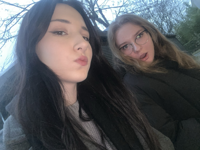 Two young women pose close together. The woman on the left has long, dark hair and is pouting at the camera. She wears a gray sweater. The woman on the right has long, wavy blond hair and round glasses. She has her mouth slightly open. She is wearing a dark jacket. They appear to be outside; branches and the sky are visible in the background. The lighting suggests it could be evening or an overcast day.