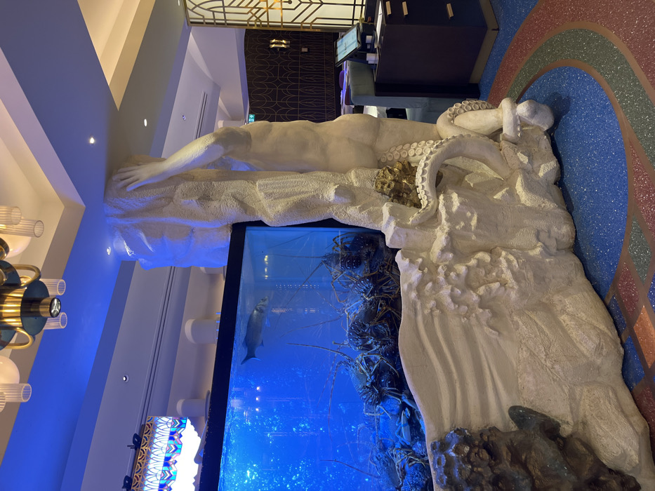 The image depicts the interior of Seafood by Olivier, located within the Hotel Tivoli Avenida Liberdade in Lisbon, Portugal. A large rectangular live seafood aquarium, brightly illuminated with intense blue light, occupies the left side of the frame. It contains numerous live European lobsters resting on the tank bottom and at least one large, silver-scaled fish, identifiable as a sea bass, swimming in the upper portion. Adjacent to the aquarium is an elaborate, textured, light-colored sculptural installation that extends from the floor to the ceiling. This sculpture features a nude, human-like torso with a raised arm and a hand resting on its head, emerging from or integrated with a craggy, rock-like formation. At its base, a large, white, multi-tentacled octopus or kraken element is sculpted, wrapping around the rock, with a small, golden, coral-like cluster embedded nearby. The ceiling is high, featuring recessed spotlights and a prominent central chandelier with a gold and teal metallic structure supporting multiple white, cylindrical, fluted light diffusers. A section of the ceiling above the aquarium is bathed in blue ambient light. The floor is a blue terrazzo-style surface embedded with multicolored chips, featuring a large circular motif composed of concentric rings in shades of red, green, and blue. In the background, a dark wall with a repeating geometric pattern in golden lines is visible, along with a decorative wall sconce. Partially visible dining tables with white tablecloths and light blue upholstered chairs suggest a restaurant setting. A dark wooden service counter, equipped with a digital display (likely a point-of-sale system) and drawers, is positioned on the far right. No people are present in the scene.