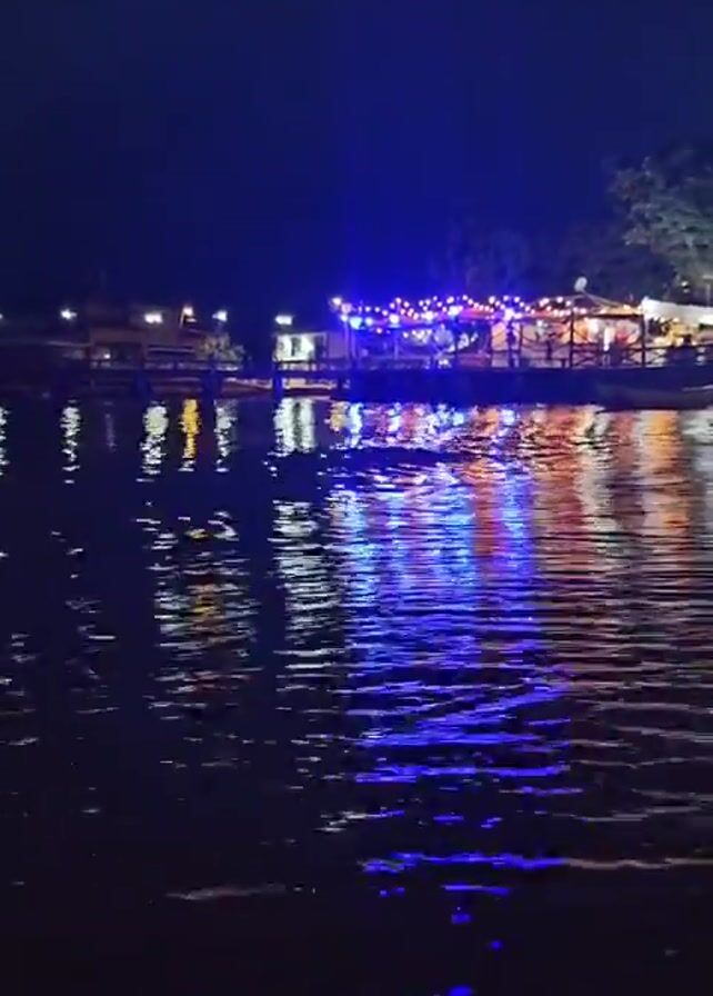At night, a body of water reflects the lights of waterfront buildings and a pier-like structure. The water is dark, with visible ripples, and reflects the blue and orange lights. The pier structure is lit with string lights and possibly some stationary lights. There may be people present, but they are distant and not distinctly visible. The night sky is dark, with limited light pollution. A tree is visible at the edge of the view.