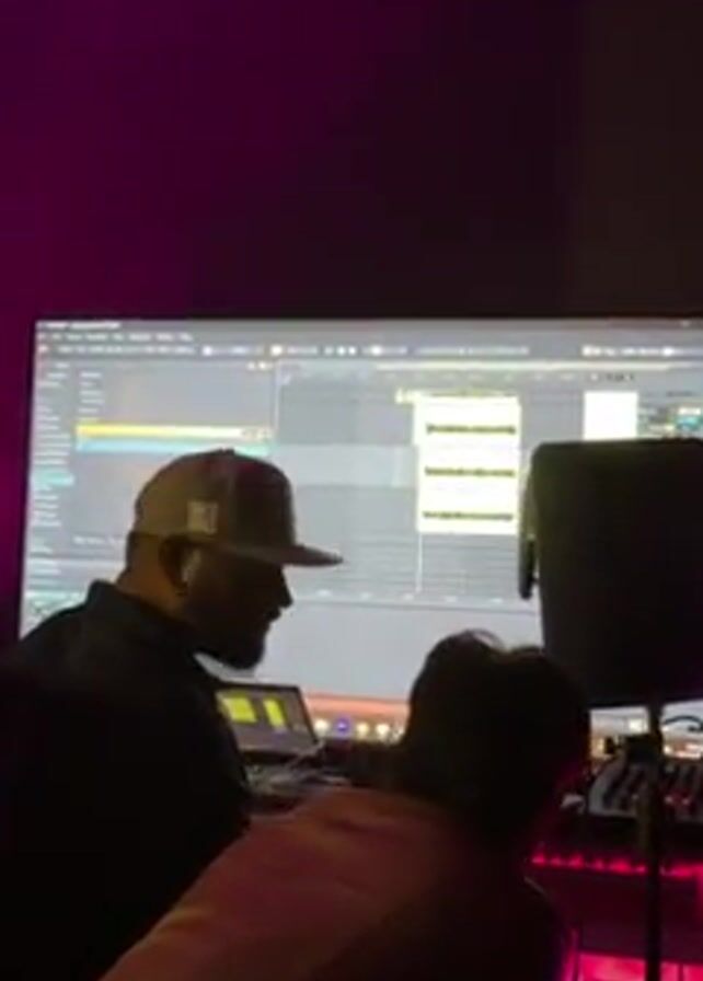Two men are in a dimly lit studio, likely a recording studio, illuminated by pink lighting. The man in the foreground is turned away from the camera and is wearing a reddish-brown jacket. Standing next to him is another man, partially obscured by the first, wearing a black shirt and a baseball cap with a logo on the front. Both men are facing a large monitor displaying digital audio workstation (DAW) software, presumably for music production. The DAW interface shows waveforms and editing timelines, indicating they are working on a music project. Other equipment visible includes a laptop, a speaker on a stand, and other electronic devices with red lights, typical of audio production setups. They seem to be focused on the DAW software and the music project.