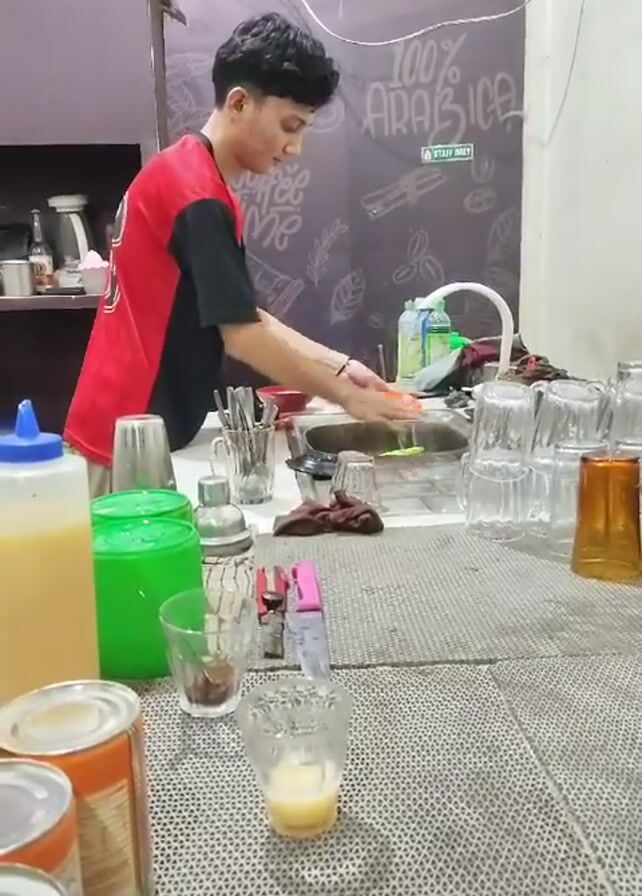 In an indoor shot, a young adult male stands behind a counter, wearing a red and black short-sleeved shirt and dark hair. He is in the process of washing dishes in a sink filled with soapy water. Several clean, transparent glasses sit stacked to his right. In front of him on the counter, there are cans, a green container, a small glass with liquid, a shaker, and various utensils. The counter is covered with a gray textured mat. Behind the man, there is a wall with a graphic featuring coffee-related images and the words "100% Arabica" and "STAFF ONLY". The background includes glimpses of shelves with bottles and a coffee maker.