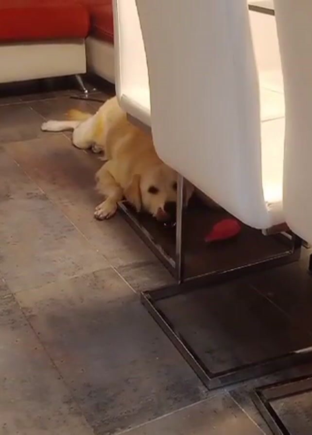 - "A golden retriever dog is lying under a glass-top dining table between two white leather chairs" by FM-AZgE62, licensed under CC BY 4.0