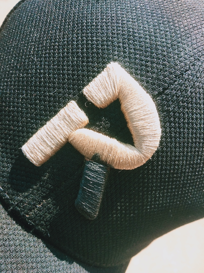 A forensic close-up captures a section of a dark, presumably black, woven textile, identified as being in Jos, Nigeria. The fabric displays a consistent, small-gauge mesh pattern. Centrally positioned is a raised, multi-segmented embroidery forming a stylized character resembling the letter 'R'. The dominant segment, comprising the upper and curved portion of the character, is constructed from tightly wrapped, light beige-colored threads, presenting a distinct corrugated texture. A smaller, vertical base segment is rendered in dark grey wrapped threads, exhibiting a similar texture. Direct illumination from the upper left creates pronounced shadows, accentuating the three-dimensional relief of the embroidery on the textile surface. No human subjects, interactions, or discernible surrounding environment are present.