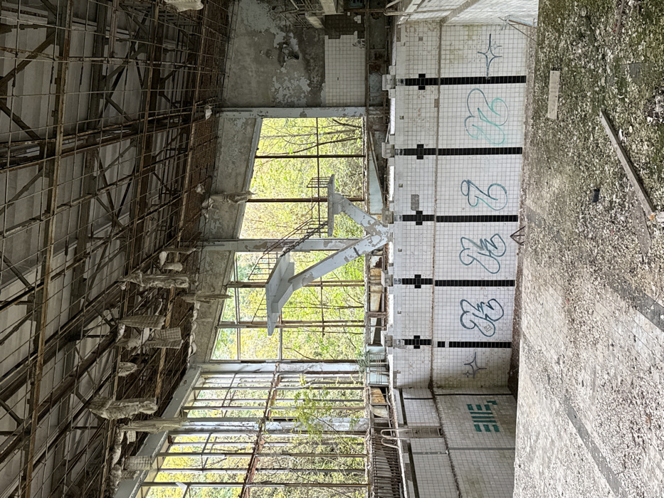 The image depicts the interior of the abandoned Azure Swimming Pool in Prypiat, Ukraine