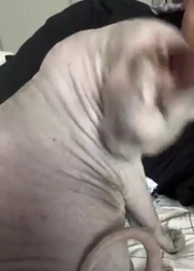 Sphynx cat sitting on a patterned bed. The cat is grooming itself, licking its neck and chest. A person is lying in the bed behind the cat, wearing a black shirt and a gold necklace. The background includes a partially visible white door. The lighting is relatively dim. The camera focuses primarily on the cat.