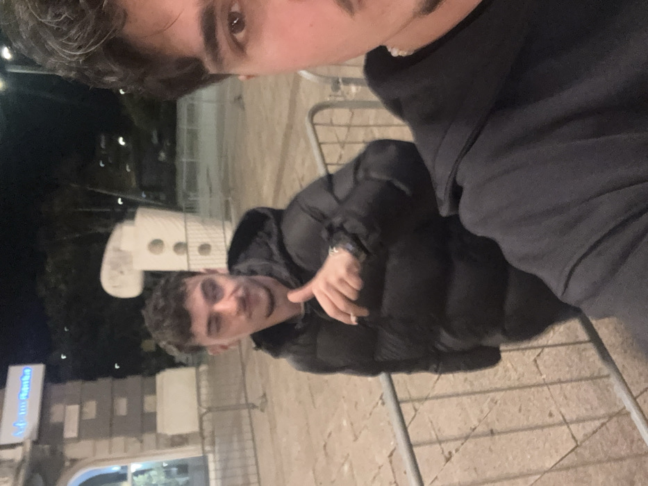 The image depicts two individuals at night in a pedestrian area of Grad Rijeka, Croatia, specifically near the Korzo, with the Addiko Bank (formerly Adria Banka) building and the Fontana Indeks (Index Fountain) sculpture visible in the background. In the foreground, the right side of a male individual's face, including the right eye, eyebrow, and part of the nose and mouth area with a mustache and goatee, is visible. This individual, presumably holding the camera, has dark, wavy hair and is wearing a dark, possibly hooded, garment with a faint pale necklace. In the midground, another male individual is centrally positioned, facing the camera. He has short, dark, curly hair, a mustache, and a light beard. He is wearing a black, puffy, hooded jacket. His right hand is raised, forming a "thumbs up" gesture, and he is holding a lit cigarette between his index and middle fingers. A silver-colored wristwatch is visible on his left wrist. His left eye appears to be winking, and he is looking directly towards the camera. The background elements are out of focus but identifiable. To the left, a multi-story building with classical architectural details and a lit sign displaying "Adria Banka" is visible. To the right, behind the central individual, stands a distinctive white, abstract sculpture with circular cutouts, identified as the Fontana Indeks. Metal crowd control barriers separate the subjects from the background. The ground is paved, and the scene is illuminated by artificial lights, indicating nighttime.