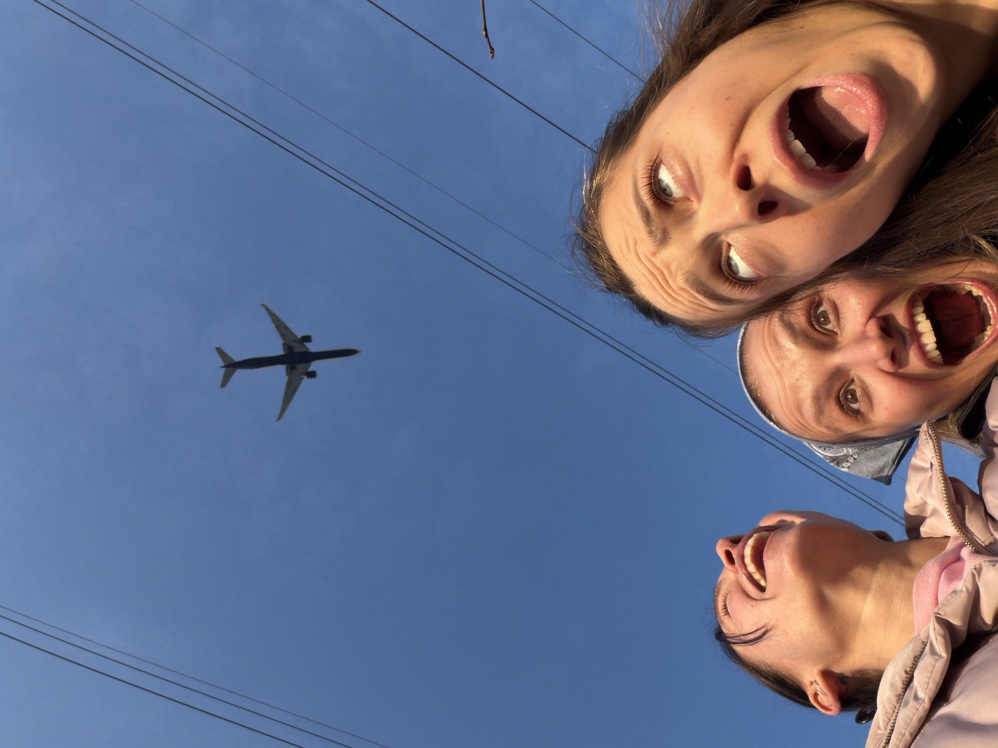 - "The image provides a low-angle, upward view of three women reacting to a low-flying aircraft against a clear blue sky, set in Khimki, Russia" by FM-GUzdA2, licensed under CC BY 4.0