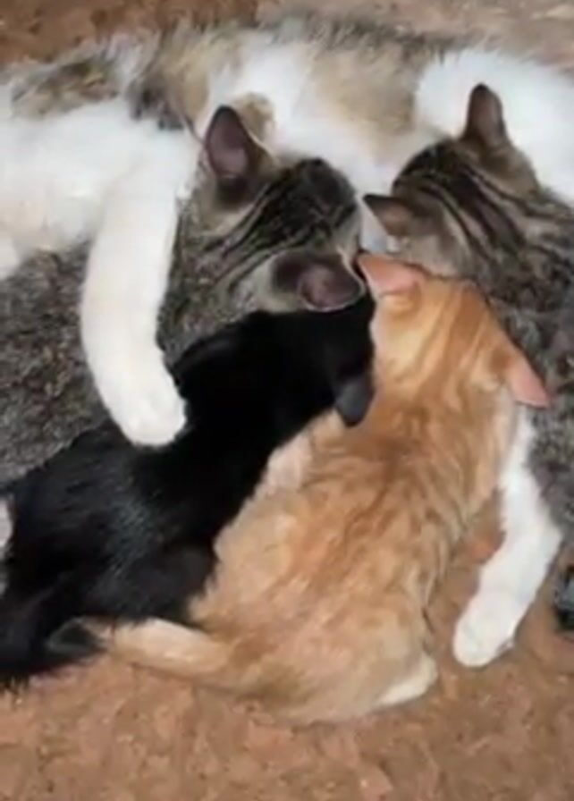 - "A cat, lying on its side on a brown carpet, nurses four kittens of various colors: orange, black, and two tabby kittens" by FM-eIoso2, licensed under CC BY 4.0