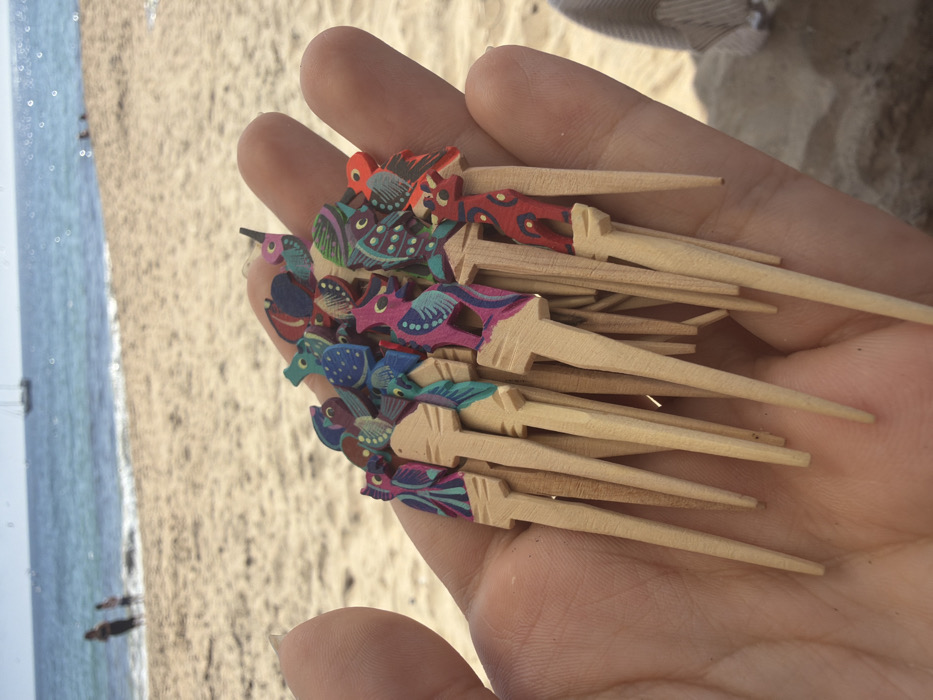 A person's hand holds numerous wooden toothpicks adorned with brightly painted bird and animal designs. The toothpicks are a natural wood color from the middle to the pointed end. The colorful designs include red, blue, pink, and green patterns. The backdrop displays a sandy beach meeting the ocean under an overcast sky. A couple of people stand on the shoreline in the distance.
