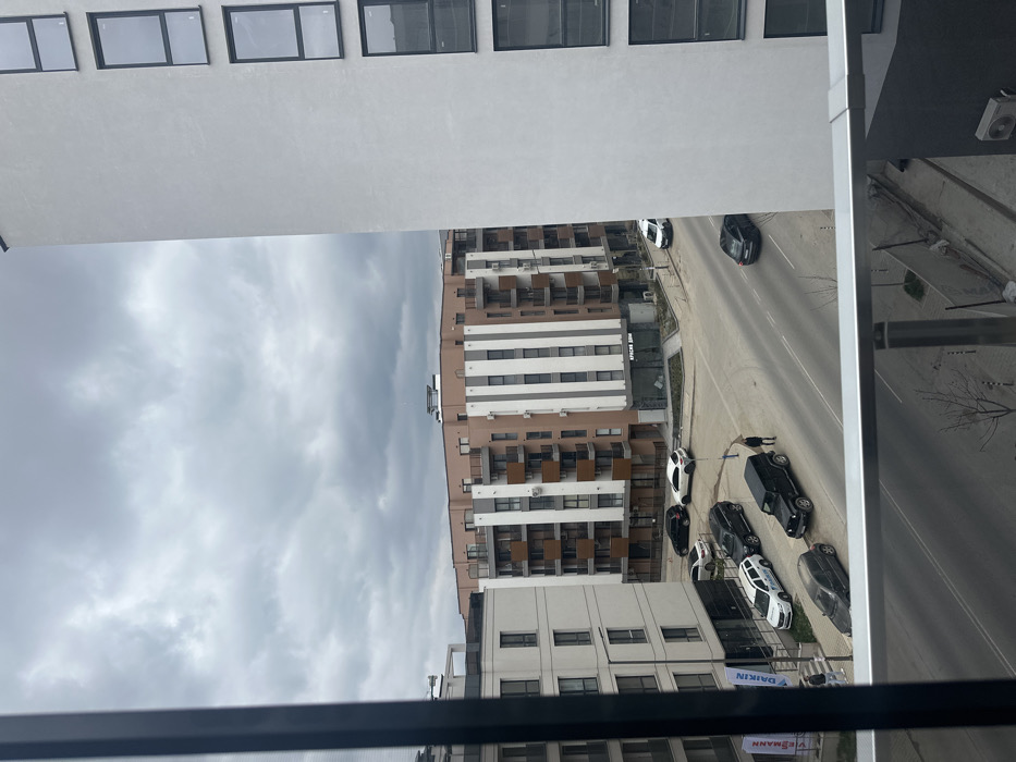 The image presents an elevated, oblique view of a city street and residential buildings in Sofia, Bulgaria, specifically in the vicinity of Blvd