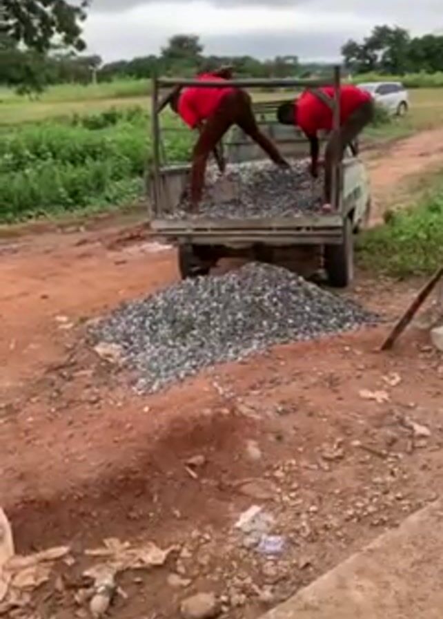 Two men in red shirts stand in the back of a small, beat-up truck, shoveling gravel onto a large pile on the ground