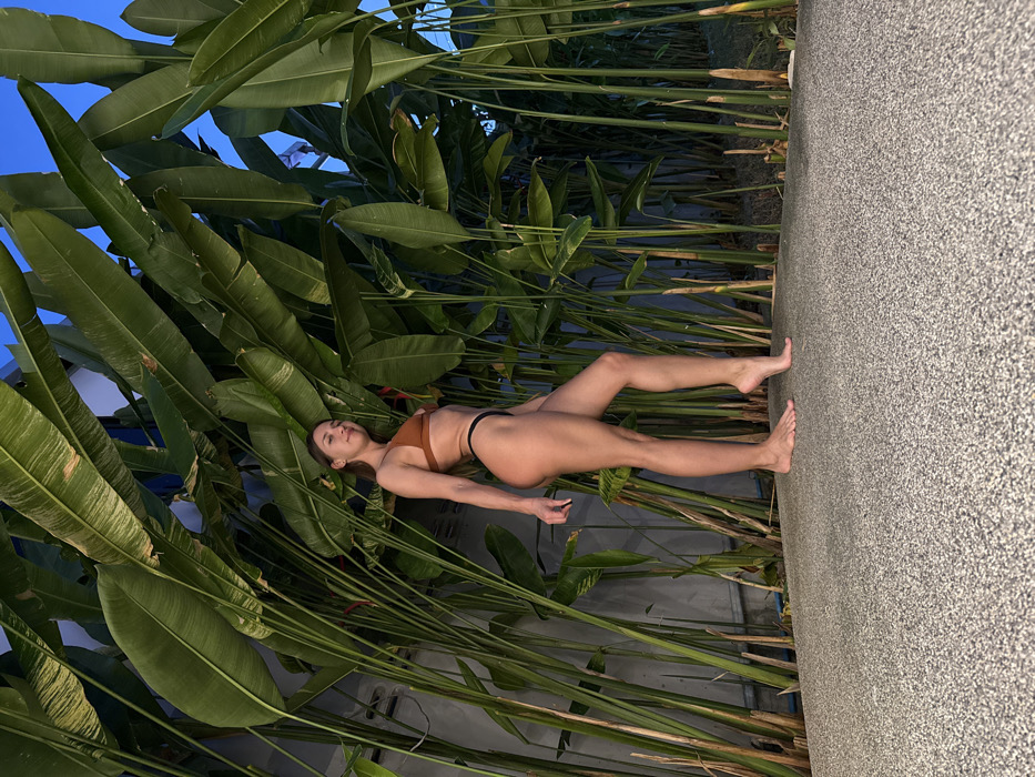 A forensic description of the image reveals a female individual standing barefoot on a dark grey, textured ground surface in an outdoor, tropical setting, likely in Kamala, Thailand, during evening or night as indicated by artificial lighting. She is positioned in a slight contrapposto pose, facing her left side towards the camera with her head turned forward, eyes partially closed. She wears a rust-colored bikini top and a black thong-style bikini bottom. Behind her, a dense arrangement of tall, broad-leafed green tropical plants forms a backdrop, with a dark wall visible intermittently through the foliage. A narrow strip of dark blue sky is visible at the top edge of the frame.