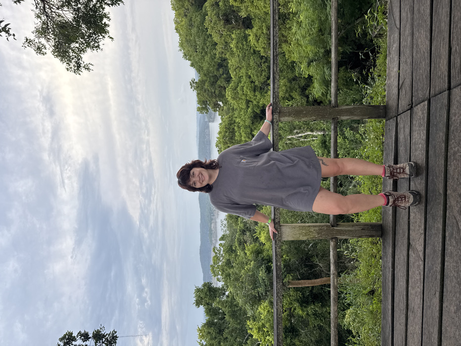 A woman stands on a wooden platform, holding onto the wooden railing. She wears a gray t-shirt dress and hiking boots with pink socks. Lush green trees fill the background, bordering a river or lake. The sky is overcast. The woman smiles toward the viewer.