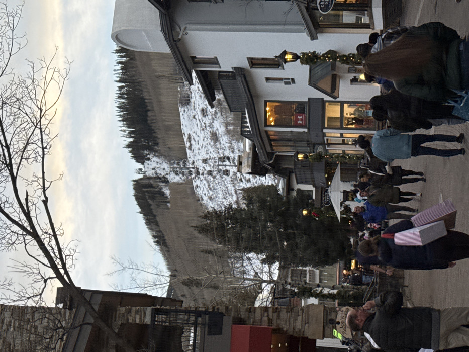 A street scene displays people strolling and shopping, with buildings lining the walkway. Christmas lights adorn the storefronts, adding a festive touch. In the background, a snow-covered mountain rises, complete with a ski lift. A bare tree stands on the left, silhouetted against the sky. The overall ambiance suggests a bustling village nestled in a picturesque mountain setting.