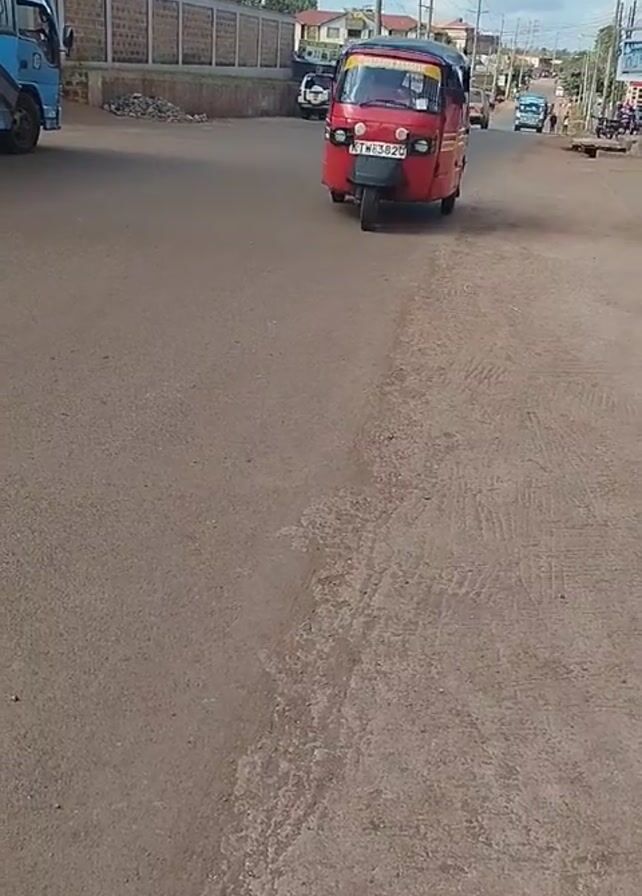 red auto rickshaw driving towards the camera on a dirt road, then passing by. A blue bus or truck is parked on the side of the road. The rickshaw has the license plate KTW8382U. There are buildings and power lines visible in the background. The sky is partly cloudy.