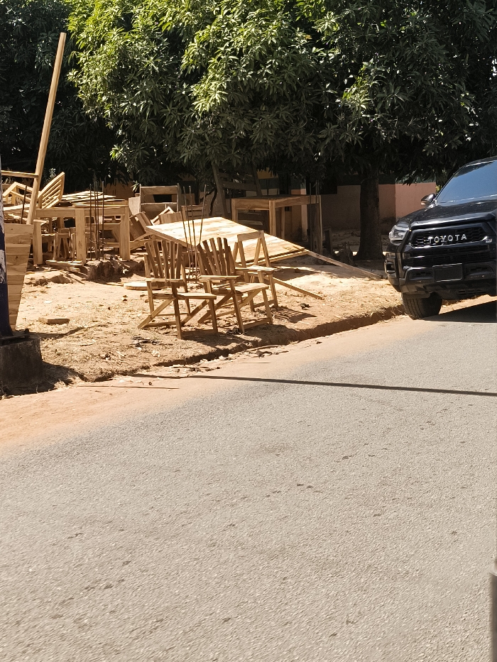 The image depicts a roadside scene in Gura Top, Nigeria, on a clear, sunny day. The foreground features a light grey asphalt road, marked by a thin, dark shadow running horizontally. Elevated from the road, the midground consists of a reddish-brown dirt area with uneven terrain, serving as an outdoor display or workshop for wooden furniture. Two light-colored wooden chairs with slatted backs are prominently positioned towards the center-right of this dirt area. Numerous other unfinished wooden furniture items, including tables, chair components, and stacked wooden planks, are scattered across the dirt, some appearing to be in various stages of construction or disassembly. Several metal rods protrude from the ground amidst the wooden structures. On the far right, the front portion of a dark-colored Toyota pickup truck is parked, partially visible with its grille and "TOYOTA" emblem facing the viewer. In the background, dense green foliage of several large trees provides shade over the scene, with a glimpse of a light pink building wall visible behind them on the right. A long, light-colored wooden pole leans upwards on the far left. No individuals are present in the image.