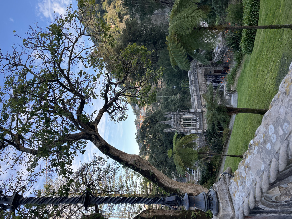 A picturesque scene unfolds with a large, bare tree branching across the frame against a partly cloudy sky. Below, a building with Gothic architecture is nestled amidst lush greenery and fern-like trees. A manicured lawn stretches to the right. An ornate stone railing borders the foreground, offering a vantage point into this landscape. The scene exudes a tranquil and historical ambiance.