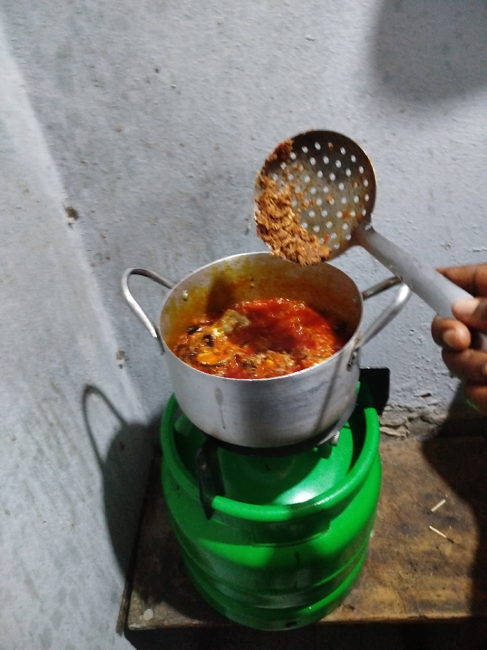 An overhead-angle shot captures a cooking scene within what appears to be an interior space in Mape, Nigeria. In the foreground, a dark-skinned right hand grasps the handle of a silver-colored, perforated metal slotted spoon, which holds a quantity of coarse, light brown, granular material. The spoon is positioned directly over a silver-colored aluminum cooking pot, which contains a bubbling orange-red stew with visible dark pieces of food, possibly meat or vegetables. This pot rests on a black metal burner grate, which is supported by a ribbed, bright green plastic gas cylinder. The gas cylinder and burner are situated on a dark wooden surface. The background consists of a light gray, textured wall exhibiting minor imperfections and a faint shadow, likely from the pot's handle.