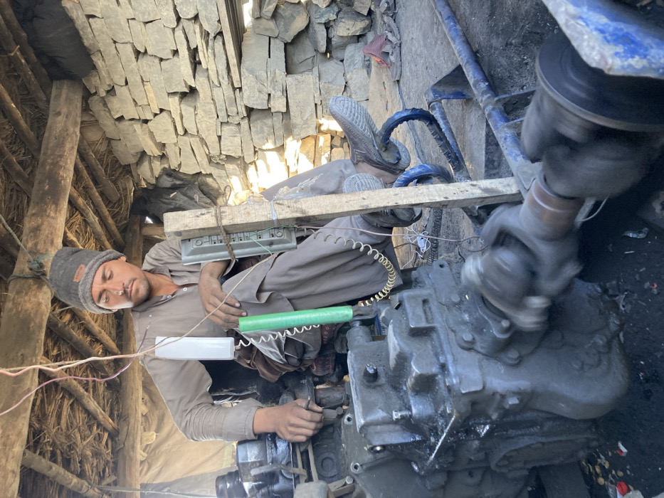 A man in a beanie and brown clothing works on a greasy, dirty engine part, possibly a transmission. He's lying on a makeshift support, likely wooden planks, beneath a crude shelter with a stone wall in the background. The scene suggests a challenging work environment, possibly in a remote or less-developed area. Tools or equipment are visible, and overall setting appears to be an automotive repair.