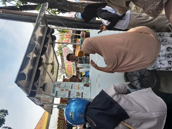 This image captures an outdoor vendor scene in Sumokali, Indonesia, during daylight. A white, wheeled vendor cart, featuring a metal frame and a black-and-white scalloped canopy, is positioned centrally. A menu board detailing various beverages, predominantly cold drinks, is prominently displayed on the cart's front. Inside the cart, a small ceiling fan and stacks of transparent plastic cups are visible. Six individuals are present. Behind the cart, two young male vendors are situated; one is partially obscured on the left, and the other, wearing a yellow shirt, is on the right. In front of the cart, four female customers are gathered. From left to right: 1. A customer, seen from the back, wears a blue motorcycle helmet with a "DOT" label, a light-colored long-sleeved shirt, and a dark hijab. 2. A customer, also viewed from the back, wears a light brown hijab and a white skirt with dark patterns; her right hand is raised, gesturing towards the vendors. 3. A customer, partially visible on the right, wears a black and white long-sleeved shirt and a black hijab, holding and observing a smartphone. 4. A fourth customer is partially visible on the far right, wearing a patterned brown garment. In the background, banners include text such as "BASO & MIE AYAM" and "ASHI GEPUK". A tall utility pole stands on the right, and a building with a tiled roof is visible on the far left. The ground appears unpaved, and trees are present in the background.