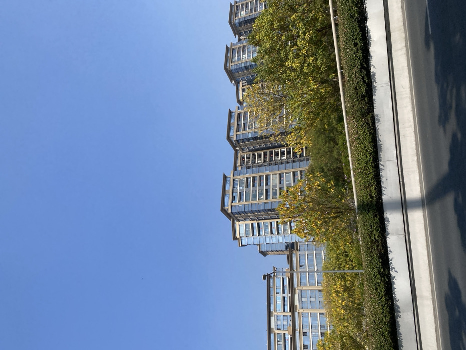 A modern, tall glass building rises against a clear blue sky. Green trees and foliage partially obscure the structure, which appears to have multiple levels and possibly balconies. A sidewalk and a road stretch out horizontally, casting shadows and suggesting an urban or suburban setting. The image is oriented sideways.