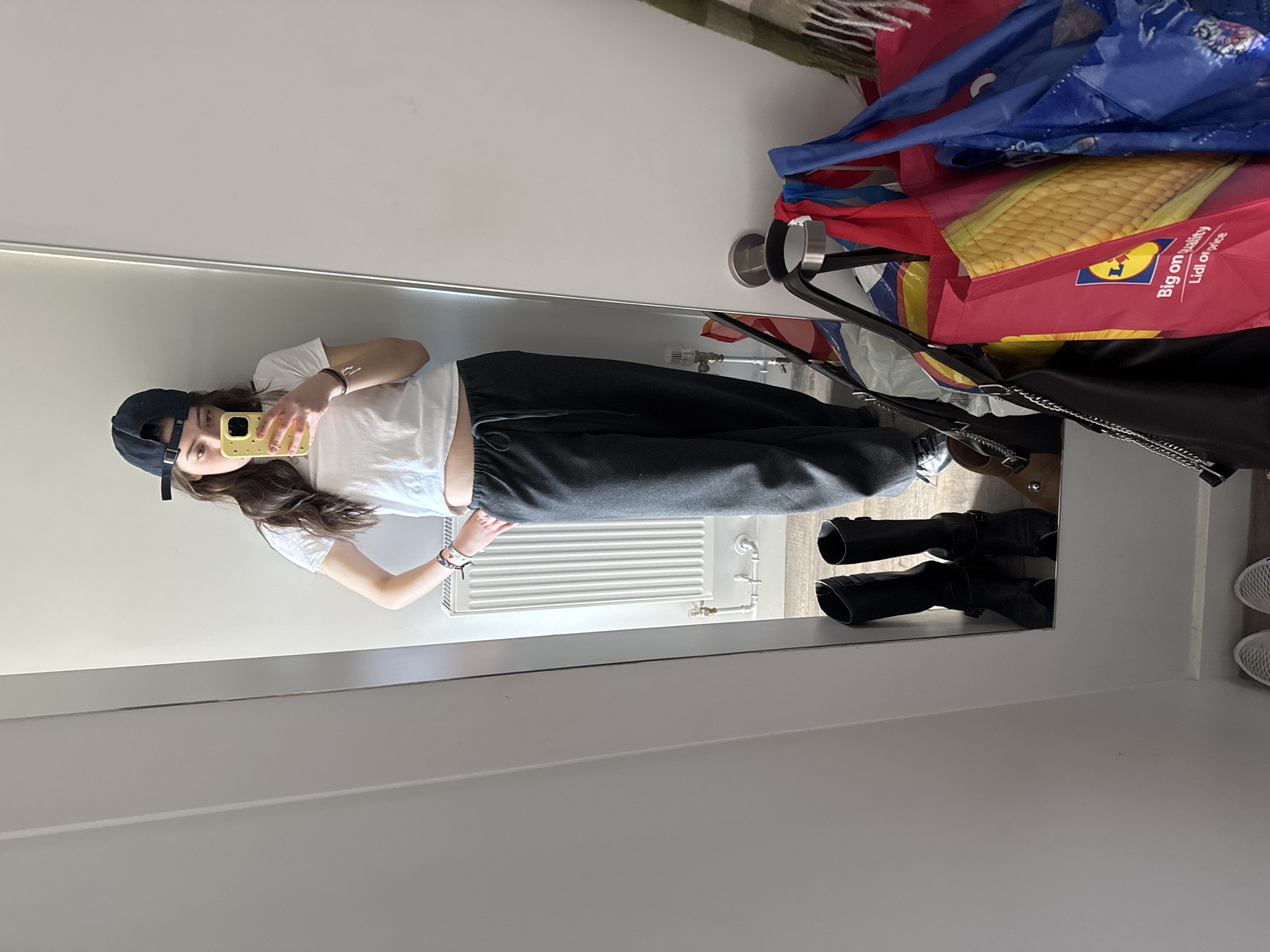 An indoor, full-length mirror image shows a young female standing in what appears to be a residential entryway or room in Hull, United Kingdom. She has long brown hair and wears a dark blue baseball cap backward, a white short-sleeved crop top, dark grey elasticated sweatpants, and white sneakers. Her hands are on her hips, and she holds a yellow smartphone with a textured case in her left hand, facing the mirror to capture the photograph. Bracelets are visible on both wrists. The reflection in the mirror reveals a white wall to the right of the subject, and a light grey vertical radiator with visible piping and a thermostat on a light wooden floor to her left. Beneath the radiator and extending across the foreground are two black tall boots, possibly biker style, with visible buckles. Adjacent to the boots, on the right side of the frame, is a brown bag with a metal chain strap, and a cluster of multi-colored reusable shopping bags. A prominent red Lidl branded bag, depicting a corn cob and the text "Big on quality Lidl price," is clearly visible, alongside blue and other patterned bags. A striped scarf with tassels, featuring green, brown, and white, hangs partially visible behind the shopping bags. The room is brightly lit.