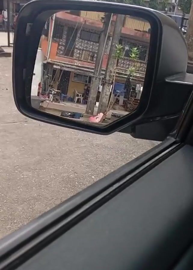 rear-view mirror of a car, capturing a scene on a street. In the reflection, there's a building with an orange facade. Chairs are visible in front of the building. A utility pole stands close by. A pink object lies on the street. Other buildings, fencing, and trees are also visible in the background. The camera appears to be stationary inside the car. The road surface is asphalt.