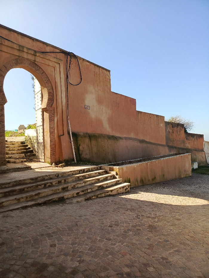 The image captures an exterior architectural scene in Meknes, Morocco, under a clear blue sky. The foreground features a paved area of small, dark, radially arranged cobblestones, partially illuminated by sunlight, casting a distinct shadow towards the left. To the left, a set of at least five worn stone steps descends towards the foreground. These steps are adjacent to a prominent light orange-brown wall system, which includes a large, pointed Moorish archway framed by a decorative pilaster-like structure. Through the archway, another set of stone steps ascends out of view, and a studded wooden gate is partially visible. Distant structures and sparse green vegetation are also seen beyond the arch. The main wall to the right of the archway is weathered, exhibiting darker discoloration and staining along its base, and features a small, rectangular, dark plaque with indistinct markings. A thick black cable or pipe runs vertically down this wall section, forming a distinct loop near the top. Further to the right, the wall steps down in height, extending into the background, with a narrow, linear stone trough running along its base. A small, light-colored shrub or tree is visible above the distant section of the wall. The scene is devoid of any individuals, animals, or active interactions.
