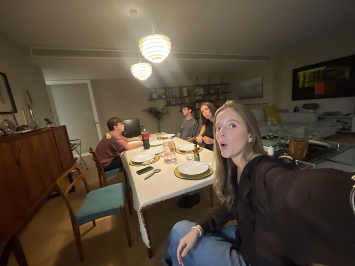 The image depicts an indoor scene within a residential setting in Matosinhos, Portugal, likely a combined dining and living area. Four individuals are present around a rectangular dining table covered with a white tablecloth. In the immediate foreground, a young adult female with light brown hair, wearing a dark long-sleeved top and blue jeans, is taking a selfie, holding the camera outwards. Her mouth is open in an expressive manner, and her gaze is directed towards the camera. Seated at the left side of the table is a young male with short dark hair and glasses, wearing a maroon t-shirt with a yellow graphic. He is looking to his right, away from the camera. Next to him, further down the table and partially obscured, is another young adult, possibly female, with dark hair, wearing a dark top, also seated. She appears to be looking towards the foreground female. A fourth individual, likely male with short dark hair and a light-colored t-shirt, is seated at the right side of the table, facing left and partially obscured by the foreground female. On the table, place settings are visible, each consisting of a white plate, a smaller decorative plate with a gold rim, and a clear glass tumbler. Objects on the table include a dark red Coca-Cola bottle, a small green bottle (possibly beer), a mobile phone, and cutlery. The room features light-colored walls and flooring. Two distinctive white, layered spherical pendant lights hang above the dining table. To the left, a dark wooden sideboard or cabinet is visible. Teal-cushioned wooden chairs are positioned around the table. In the background, a shelving unit containing books and decorative items is present, along with a large, dark-framed abstract painting on the far right wall. A sofa or bed with light-colored bedding is also partially visible in the background. A black television or monitor is positioned behind the young male on the left side of the table. A green potted plant sits on the shelving unit.