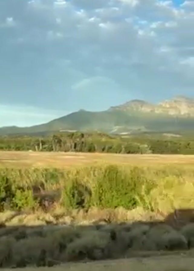 landscape of rolling hills and fields under a partly cloudy sky. In the distance, a mountain range stretches across the horizon. The fields in the foreground are predominantly yellow and brown with patches of green vegetation. The camera appears to be moving, likely from a vehicle traveling along a road.