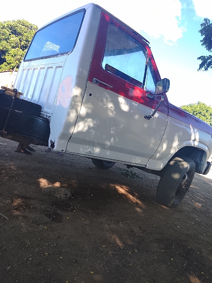 two-tone red and white pickup truck cab, observed from a low angle, on an unpaved earthen surface in San Antonio, Venezuela