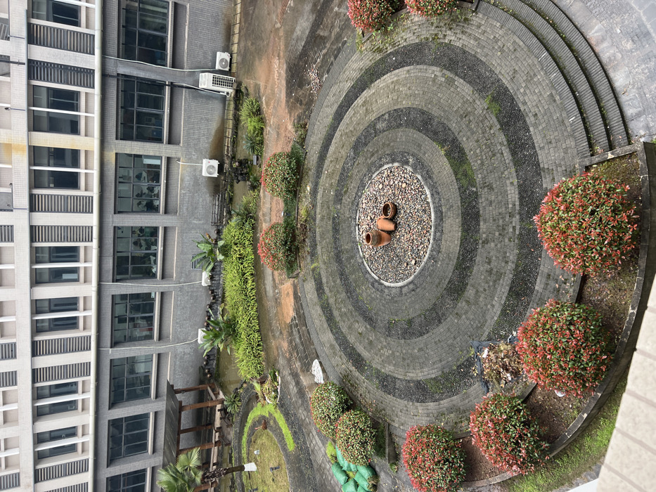 An aerial perspective depicts an outdoor courtyard or plaza area within the city of Jiangjin, China, situated adjacent to a multi-story building. The scene appears overcast and surfaces are damp, indicating recent precipitation. The central feature is a large circular paved area composed of concentric rings of dark gray rectangular pavers and black gravel. At the very center of this design, a smaller circular bed filled with light-colored pebbles contains three terracotta pots of varying sizes; one is upright, one is tilted, and one is lying on its side. Surrounding the circular paved area, particularly in the foreground, are manicured bushes with reddish-green foliage, arranged in curved beds. To the left, several large green bags, possibly containing gardening materials, are stacked near a row of these bushes. Further back, on either side of the paved circle, are additional garden beds featuring various green plants and shrubs. A small palm tree stands near a wooden gazebo with a dark roof and benches, located on the left side of the courtyard closer to the building. The background is dominated by the facade of a multi-story building. Its upper section is light-colored with numerous rectangular windows, while the lower section is a darker gray, possibly brick or concrete, featuring a series of larger, tinted windows. Multiple white outdoor air conditioning units are mounted on the lower building wall, with associated vertical conduits. A dark-colored bench is partially visible in the garden area near the building on the right. The paved walkways and ground surfaces exhibit scattered small debris and some moss or algae growth in crevices. No individuals, animals, or explicit actions are observed within the scene.