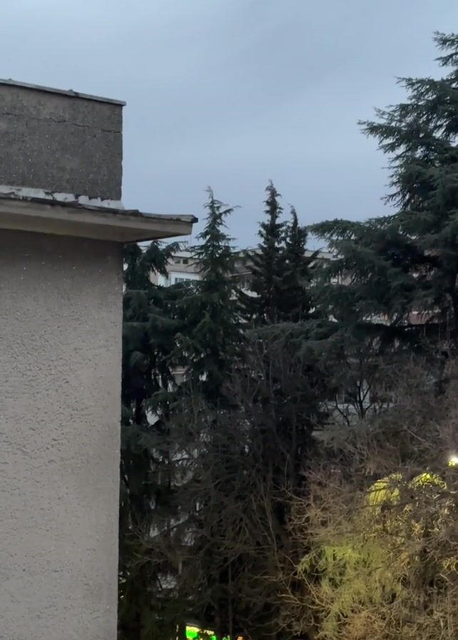 The scene is captured from an elevated vantage point, likely an apartment window, showing a view of a gray, overcast sky, several evergreen trees, and a section of a building