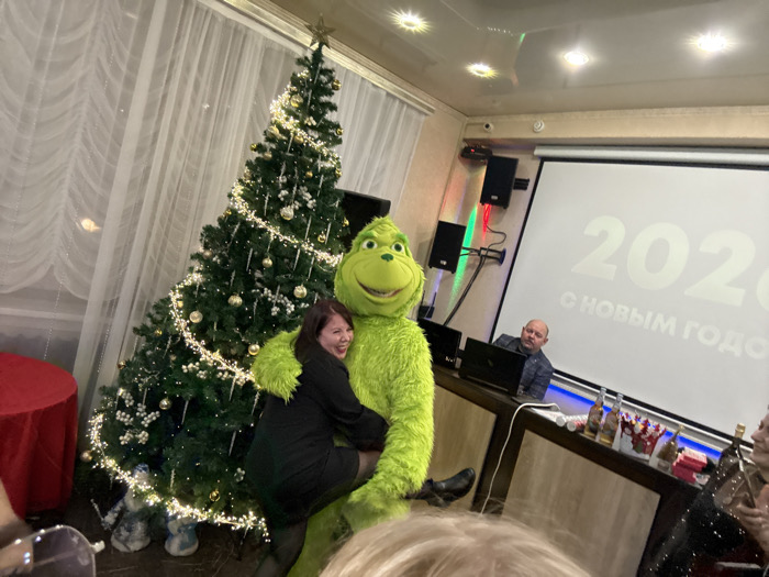The image captures an indoor celebratory event in Ust-Ilimsk, Russia. In the center, a woman with dark hair, wearing a black dress and tights, enthusiastically embraces a person in a bright green, full-body Grinch costume. The woman is smiling broadly, and her right leg is bent as if lifting. The Grinch costume includes the character's distinct face and furry texture, with its right arm around the woman's back. To the left of the central figures stands a tall, artificial Christmas tree decorated with warm white string lights, gold spherical ornaments, white icicle ornaments, and topped with a gold star. Two small, gnome-like figurines in white and blue are positioned at the tree's base. White, translucent curtains are visible behind the tree. In the background, to the right, a white projection screen displays large white numerals "2020" and the Cyrillic text "С НОВЫМ ГОДОМ!" (Happy New Year!). Below the screen, a bald man in a plaid shirt is seated behind a wooden table, observing the scene with an open laptop in front of him. The table also holds several bottles and small red packages or boxes. Two black speakers are mounted on the wall to the left of the screen, with visible cables emitting red, green, and blue light. The ceiling features multiple recessed spotlights. Partial views of other attendees are visible in the extreme foreground and on the far right.