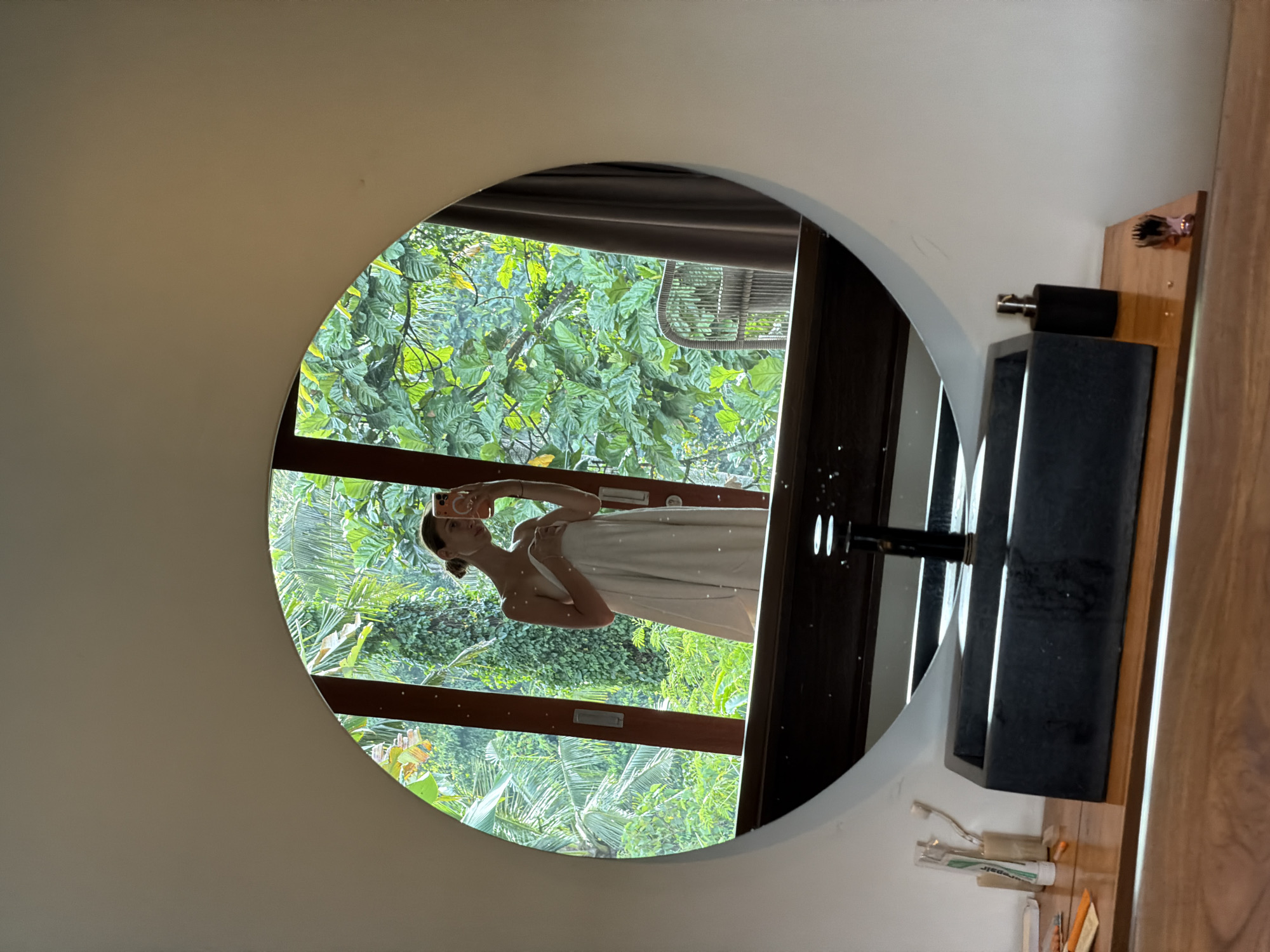A round mirror reflects a woman holding a phone, partially covered in a towel, with a dense green tropical forest visible behind her through a window