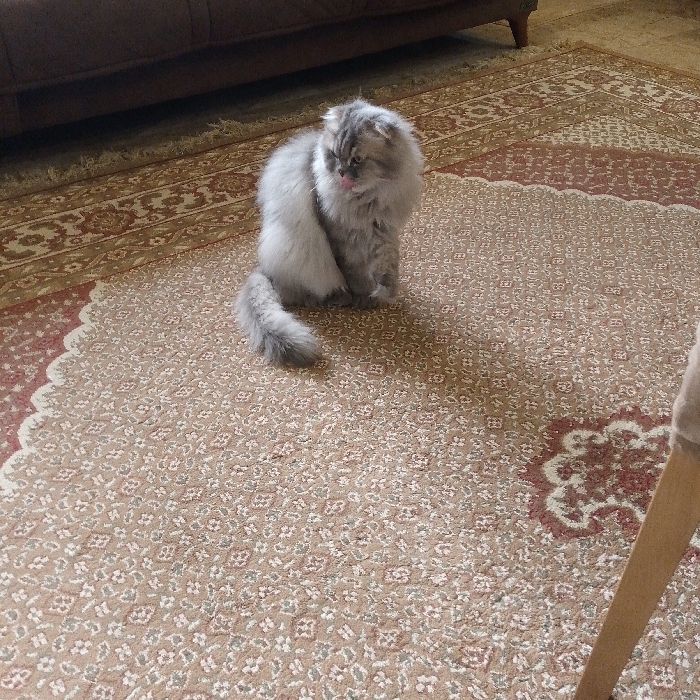 This image depicts an indoor domestic setting in Baghdad, Iraq. The primary subject is a long-haired cat, likely a Persian or a similar breed, characterized by its dense, light grey and white fur and bushy tail. The cat is seated upright on a patterned area rug, positioned slightly left of the frame's center. Its head is turned towards the right, and its small pink tongue is partially extended from its mouth, suggesting an ongoing or recently completed grooming action. The floor is covered by a large area rug featuring a main field of repetitive small floral or geometric patterns in shades of beige, light brown, off-white, and light grey. A distinct border, with a scalloped edge and a more elaborate curvilinear design incorporating dark red/burgundy and cream colors, is visible along the left side of the rug. In the upper left background, the lower portion of a dark brown upholstered furniture piece, possibly a sofa or armchair, with decorative legs, is partially visible. The lower right foreground shows the single wooden leg of another piece of furniture, likely a table or chair. The overall lighting is soft and ambient, indicative of an interior space. No other people or animate subjects are visible, and no direct interactions are depicted beyond the cat's apparent self-grooming.