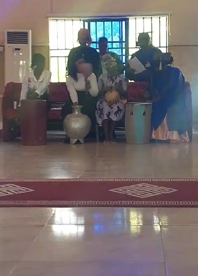 Seven people are positioned on a stage in front of a window. Six of them are seated on a reddish-brown couch, while one stands behind them. Two of the seated individuals are positioned in front of drums, and the woman in the center holds a large, vase-shaped pot. A maroon rug lies on the tiled floor in front of the group. The sign at the top reads “MINISTRIES/ WOMEN FELLOWSHIP.” There is a large air conditioning unit on the left side. As the recording proceeds, colorful lights flash on the scene.