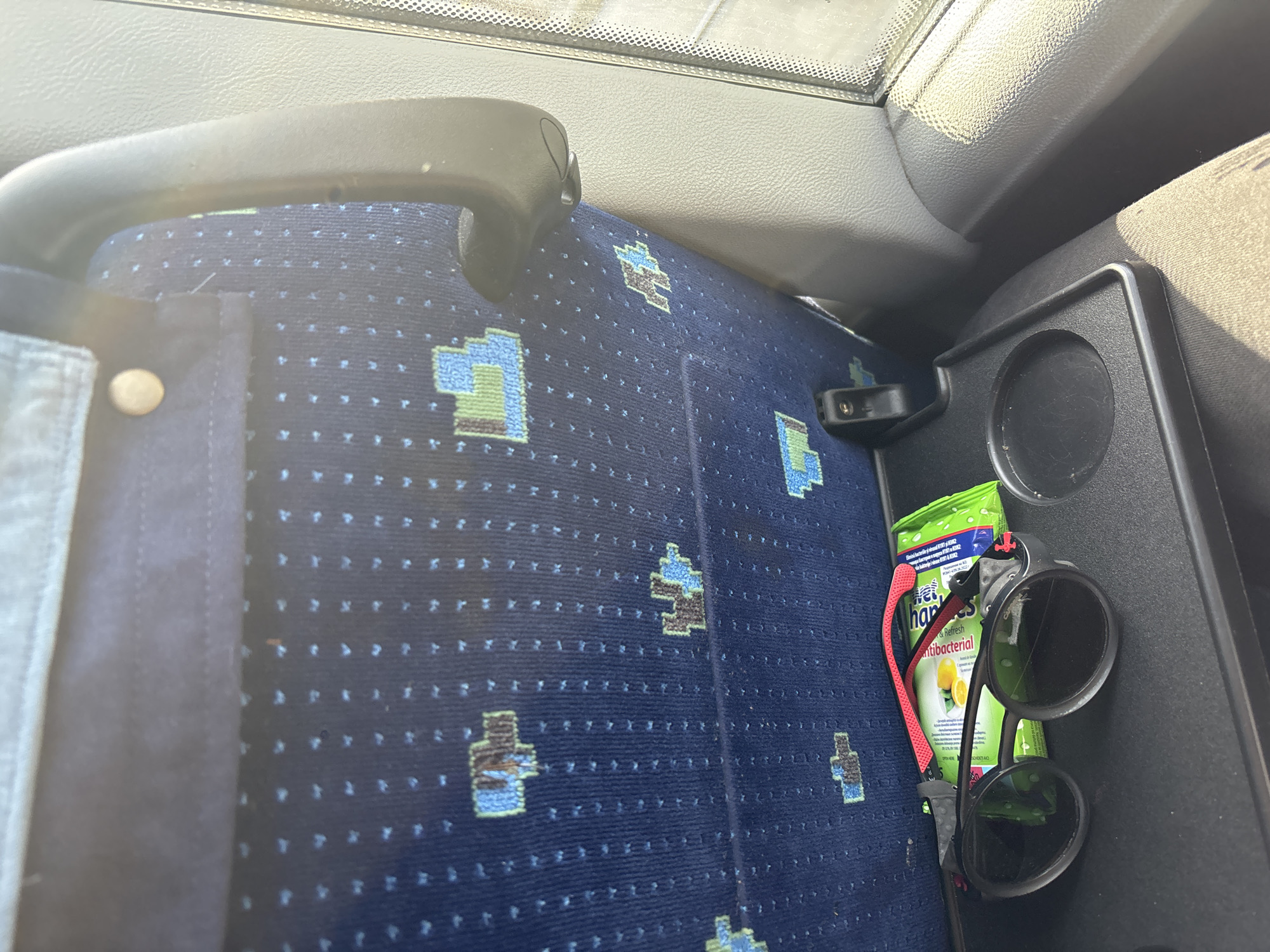 interior of a possibly public transport vehicle, such as a bus or train, likely traveling in Sofia, Bulgaria based on the presence of an information pamphlet written in Bulgarian. A seat covered in a blue fabric with geometric patterns is visible. On the adjacent tray table are a package of "Antibacterial" wet wipes, and a pair of sunglasses. The location is inferred based on the Bulgarian text in the wet wipe packaging.